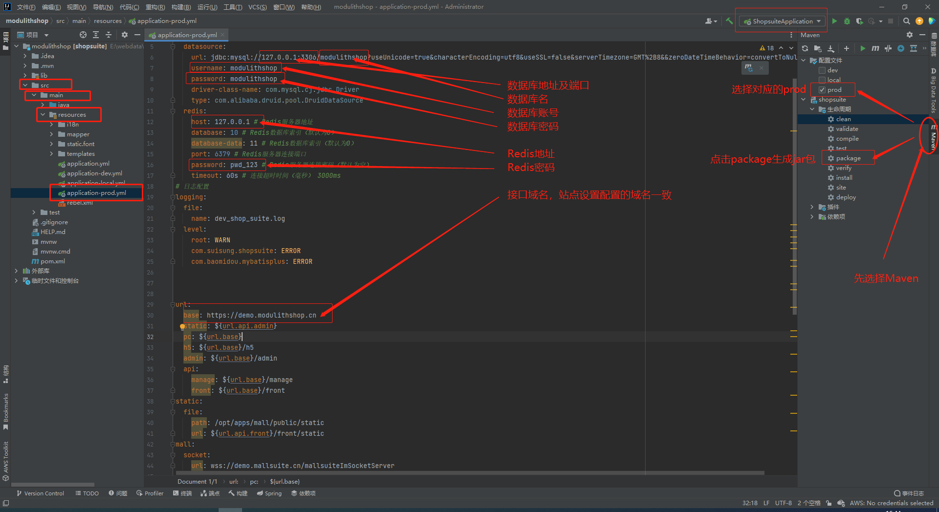 修改数据库配置,Redis配置:
