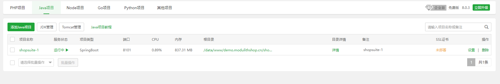 把生成的shopsuite-1.0.0.jar上传到创建的站点目录。演示路径:/data/www/demo.modulithshop.cn/