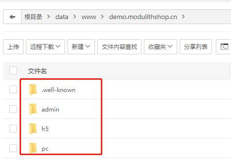 把dist重命名为admin,上传到创建的站点目录:演示路径:/data/www/demo.modulithshop.cn/